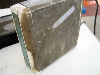 HDD外装裏面:基板が水分と消火剤の成分で錆び始めている(酸化)のが解ります。 ↓ |
