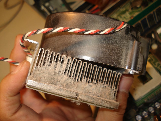 写真左:DELL Dimension4600cの分解状況 : 分解清掃が修理の基本です。 この作業の後にコンデンサー交換などの半田付け作業になります。